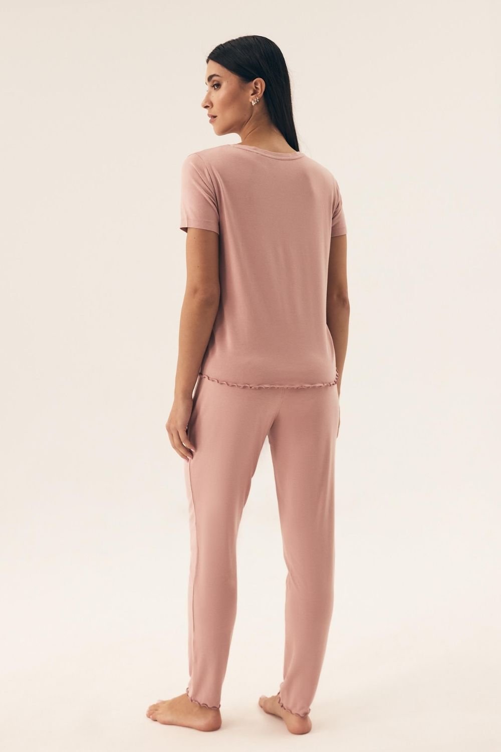 Ši basic stiliaus moteriška pižama yra idealus komforto ir klasikinės elegancijos derinys. Pagaminta iš minkštos, kvėpuojančios medžiagos, leidžia odai kvėpuoti ir užtikrina patogumą visą naktį. Blūzė su trumpomis rankovėmis turi V formos iškirptę, kuri subtiliai pabrėžia kaklą, o apačia su mereska prideda jai švelnumo. Laisvas, patogus kirpimas užtikrina judėjimo laisvę. Ilgos kelnės be kišenių, su platu juosmens gumą, puikiai prisitaiko prie figūros ir užtikrina patogumą. Visuma supakuota į praktišką krepšį, todėl pižama puikiai tinka kaip dovana. Ideali pasirinkimas moterims, vertinančioms paprastumą, kokybę ir patogumą!