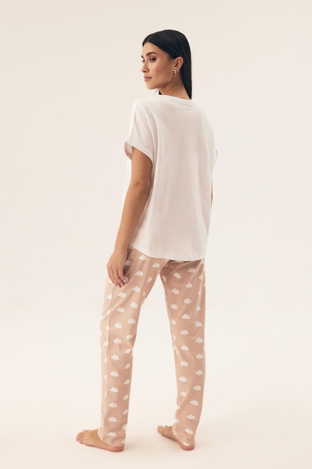 Ši moteriška pižama yra puikus pasirinkimas moterims, kurios ieško patogumo ir subtilaus stiliaus derinio. Mažo rankovo bluzė su apvaliu iškirčiu, puošta madingu raštu, turi laisvą, patogų kirpimą, užtikrinantį visišką judėjimo laisvę. Pagaminta iš minkštos ir pralaidžios medžiagos, ji puikiai tiks bet kuriuo metų laiku. Ilgomis, be kišenių, su raštu apatinės dalies kelnėmis yra patogios ir stilingos. Plotus gumas juosmens srityje užtikrina puikų prigludimą ir patogumą visą naktį. Pižamos neutrali spalvų paletė suteikia jai elegantišką ir amžiną charakterį. Tai puiki pižama ramiam miegui, kuri užtikrins jums patogumą ir madingą išvaizdą jūsų namų jaukumoje.